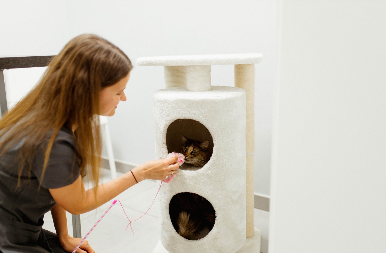 Nic na siłę. Pozwalamy zwierzakowi oswoić się z przestrzenią, zapachami, dźwiękami i personelem. Dajemy czas na eksplorację gabinetu, uczymy pozytywnych skojarzeń (smakołyki, zabawa, nagrody) – wszystko bez badania, bez stresu. To spotkanie „na luzie”, które procentuje w przyszłości.